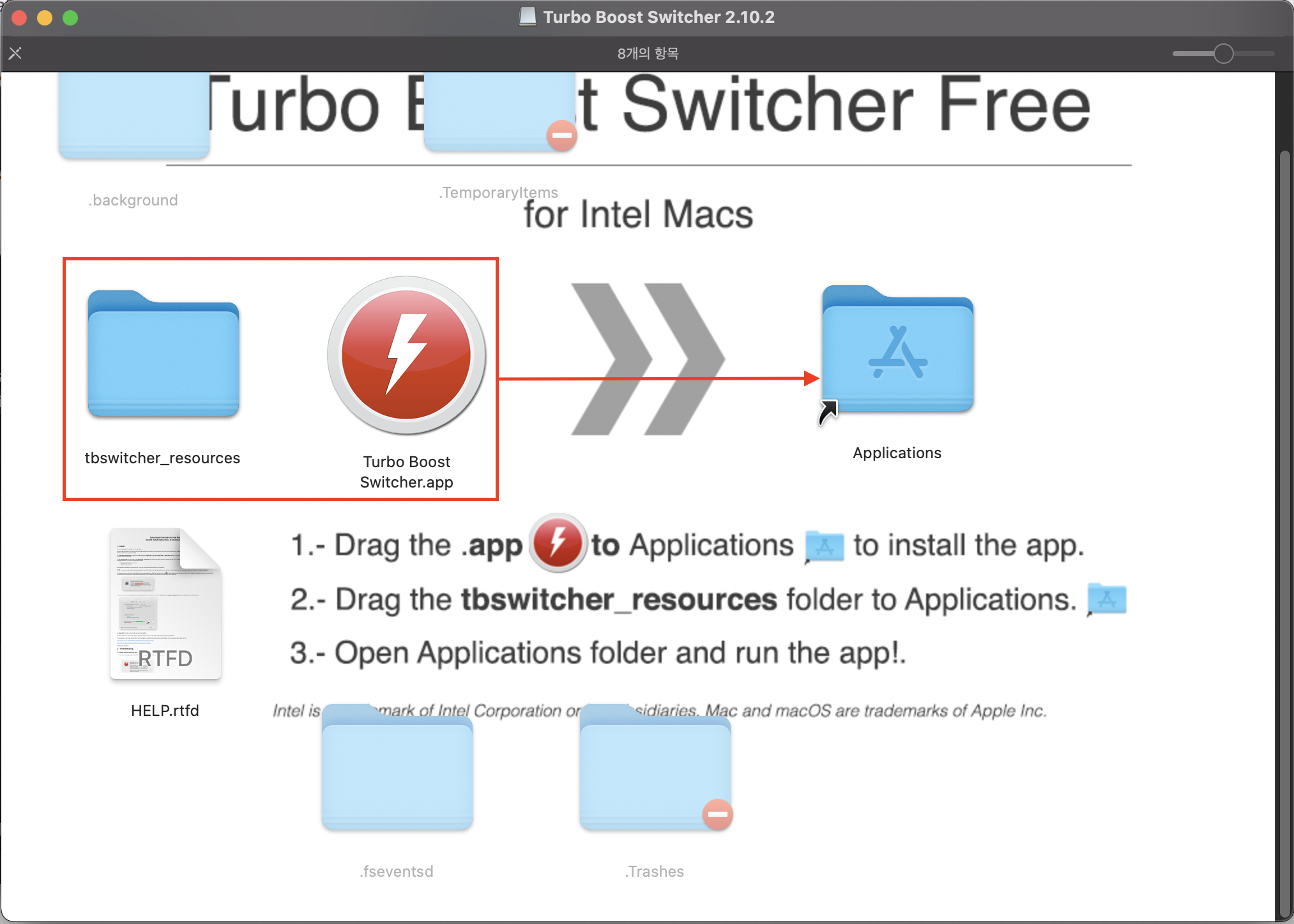 다운로드 폴더 - Turbo_Boost_Switcher_v?.?.?.dmg 파일을 더블 클릭하여 열어줍니다.