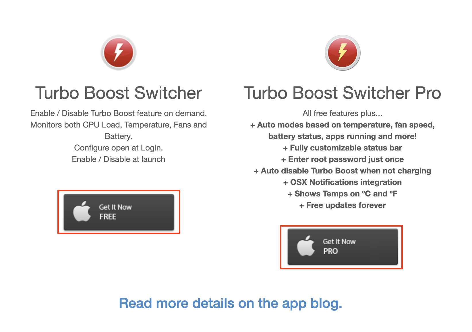 Turbo Boost Switcher Enable / Disable Turbo Boost feature on demand. Monitors both CPU Load, Temperature, Fans and Battery. Configure open at Login. Enable / Disable at launch Turbo Boost Switcher Pro All free features plus... + Auto modes based on t