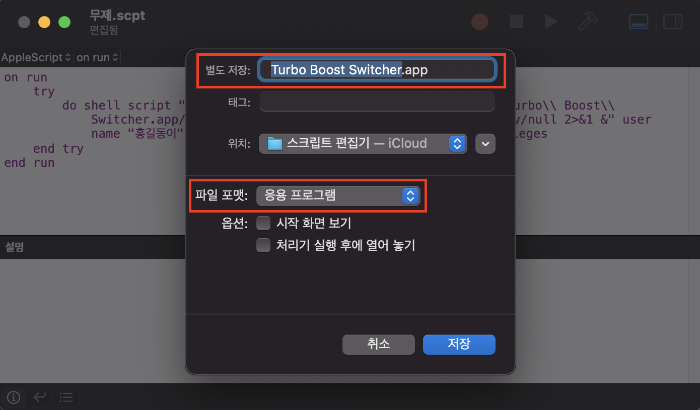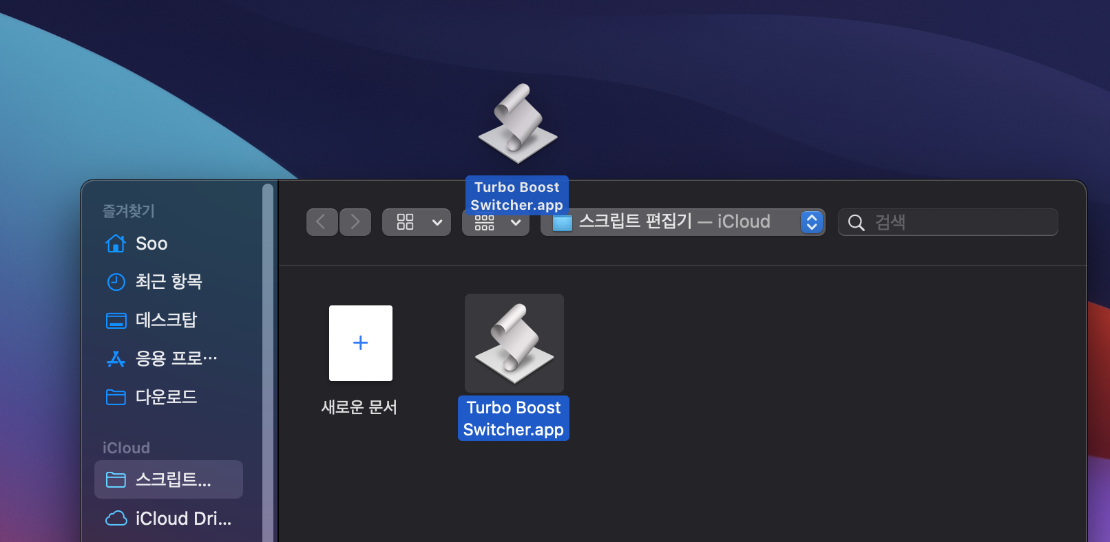 좌측 직접 만든 Turbo Boost Switcher.app 으로 드래그 & 드랍해서 옮겨주세요.