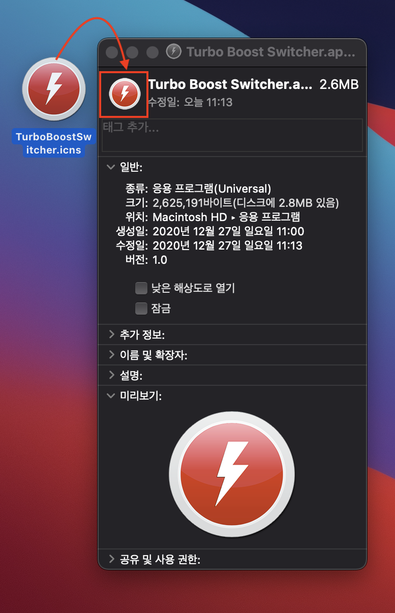 찾았던 TurboBoostSwitcher.icns 을 드래그 & 드랍으로 위 사진에 넣어줍니다.