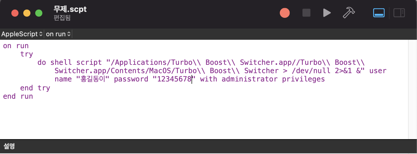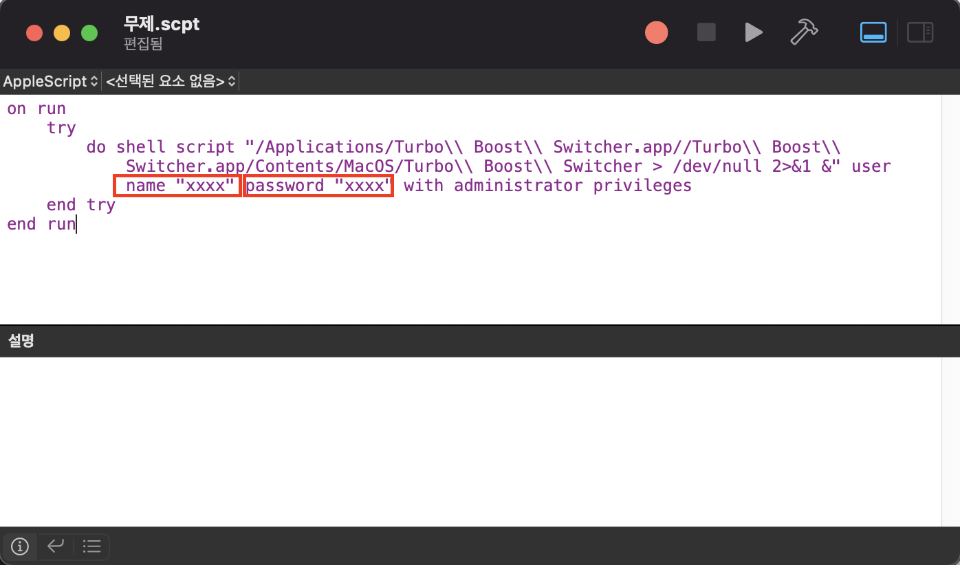 do shell script "/Applications/Turbo\\ Boost\\ Switcher.app//Turbo\\ Boost\\ Switcher.app/Contents/MacOS/Turbo\\ Boost\\ Switcher > /dev/null 2>&1 &" user name "xxxx" password "xxxx" with administrator privileges