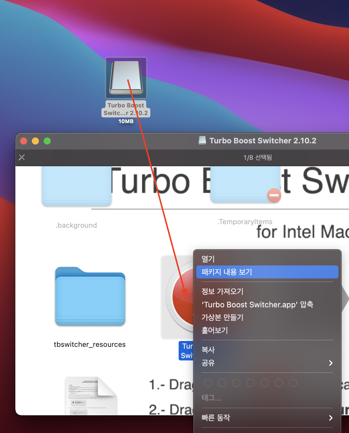 홈페이지에서 다운받은 dmg 파일 - 더블 클릭 - Turbo Boost Switcher.app - 우클릭 - 패키지 내용 보기
